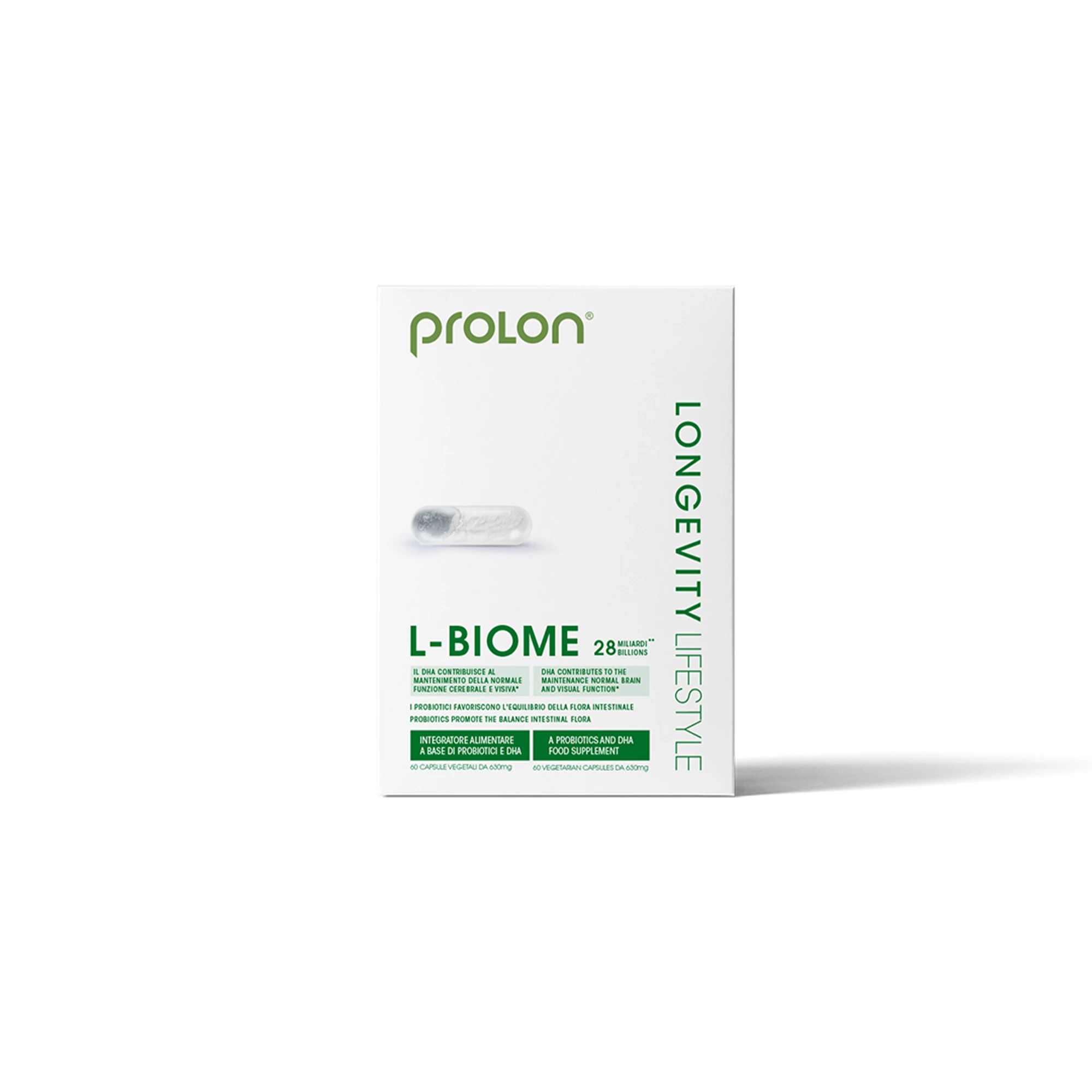 L-Biome è stato sviluppato dagli scienziati del Longevity Institute dell'Università della California del Sud in collaborazione con i medici di L-Nutra. È progettato per il microbioma post-digiuno ProLon di 5 giorni, da una combinazione di prebiotici, probiotici e DHA, il tutto in una singola capsula giornaliera, grazie a una tecnologia avanzata. L-Biome è un integratore progettato per mantenere il microbioma sano per una maggiore longevità. La sinergia di Bifidobacterium Breve B3, Lactobacillus Rhamnosus HN001, Inulina e DHA.